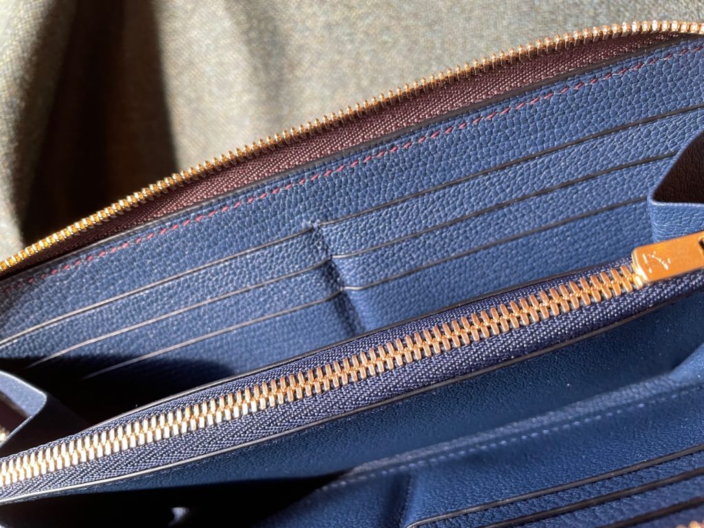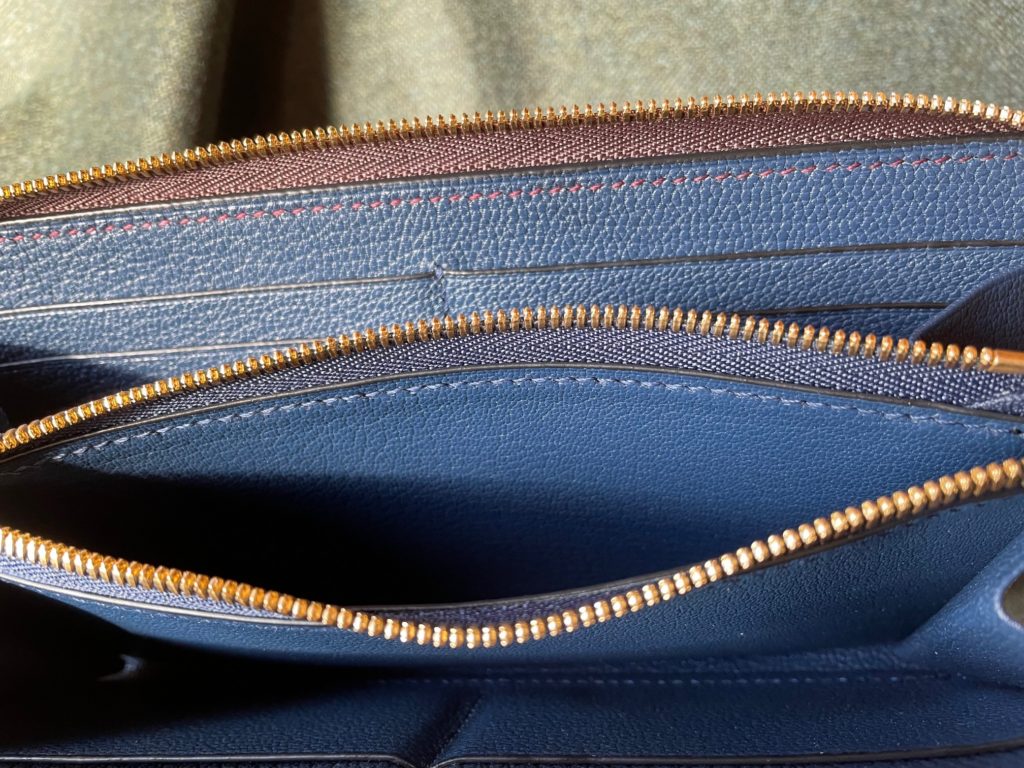 オーダーのこだわりとしては、カードホルダーの内側やコイン入れの内側もオールレザーであること。