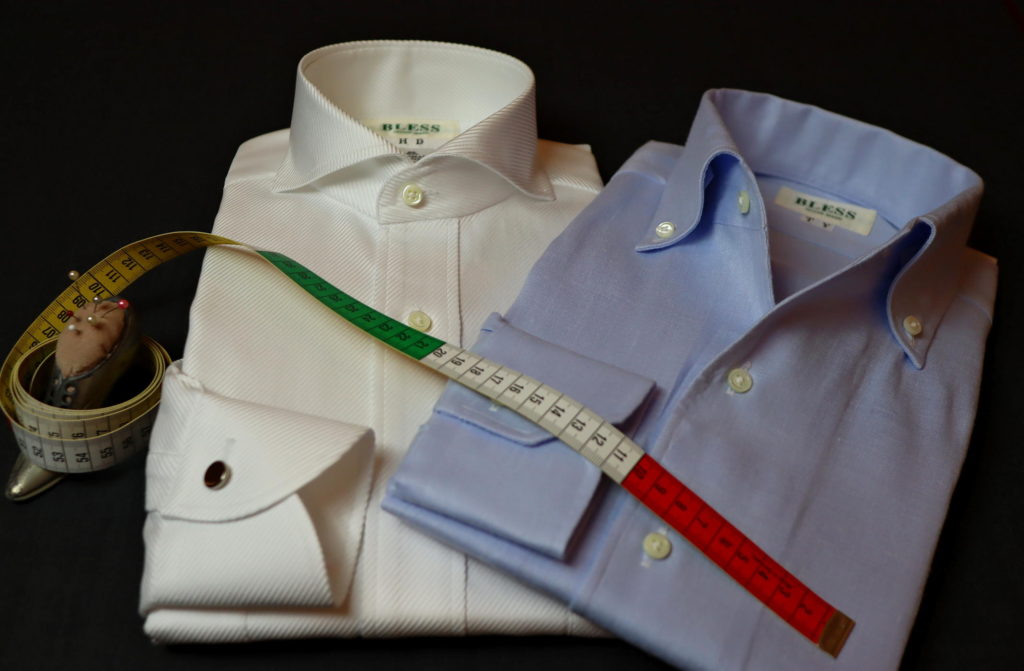 右のブルーのシャツはイタリアンボタンダウンで、きれいな立体感が一目瞭然。